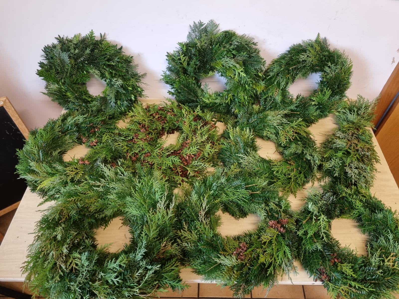 10 fleißige Frauen haben am Dienstag vormittag gesamt 20 Adventskränze gebunden und ein paar davon noch adventlich geschmückt. Diese werden an die Kirchengemeinde Bibersfeld gespendet und dort am Adventsbasar verkauft.